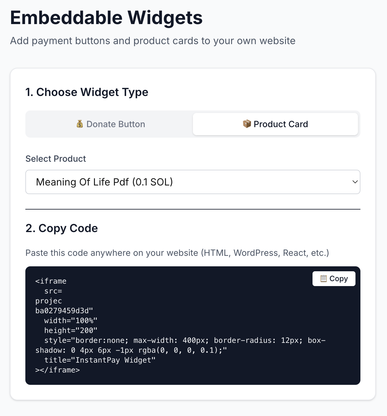 - π Product Widget: A rich card displaying your product details and a "Buy Now" button.